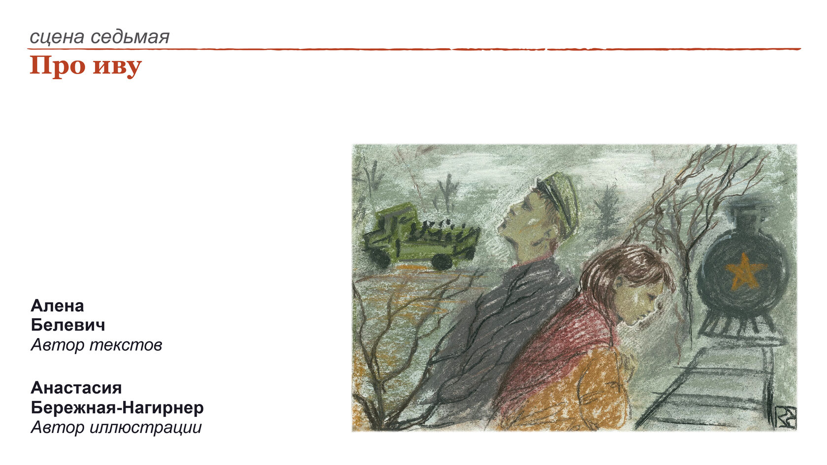 Бабушка: Как звали? Звездочка! Видите, у нее на лбу белое пятнышко, вот и звали ее из-за него Звездочкой. Ты меня не отвлекай, а то я все позабуду. Жила, значит, Звездочка, жила. А потом, когда война началась, то фашисты к ним в деревню пришли и все забрали. А Звездочку старик-хозяин в сарай спрятал, сеном засыпал сверху, тряпками старыми закидал. И ее не заметили. А как стемнело, отвел старик Звездочку в ближайший лесок и там спрятал. Оказались они в оккупации. До наших не добраться, далеко. Каждый день они надеялись, что к ним пробьются и прогонят фашистов. Но все никак. И тут узнали они, что Ленинград в кольце и что нет у ленинградцев хлеба. Пошел старик по домам в селе, у кого что собирать, чтобы в Ленинград отправить. А соседи его спрашивают: «Как это все в Ленинград доставить собираешься?»