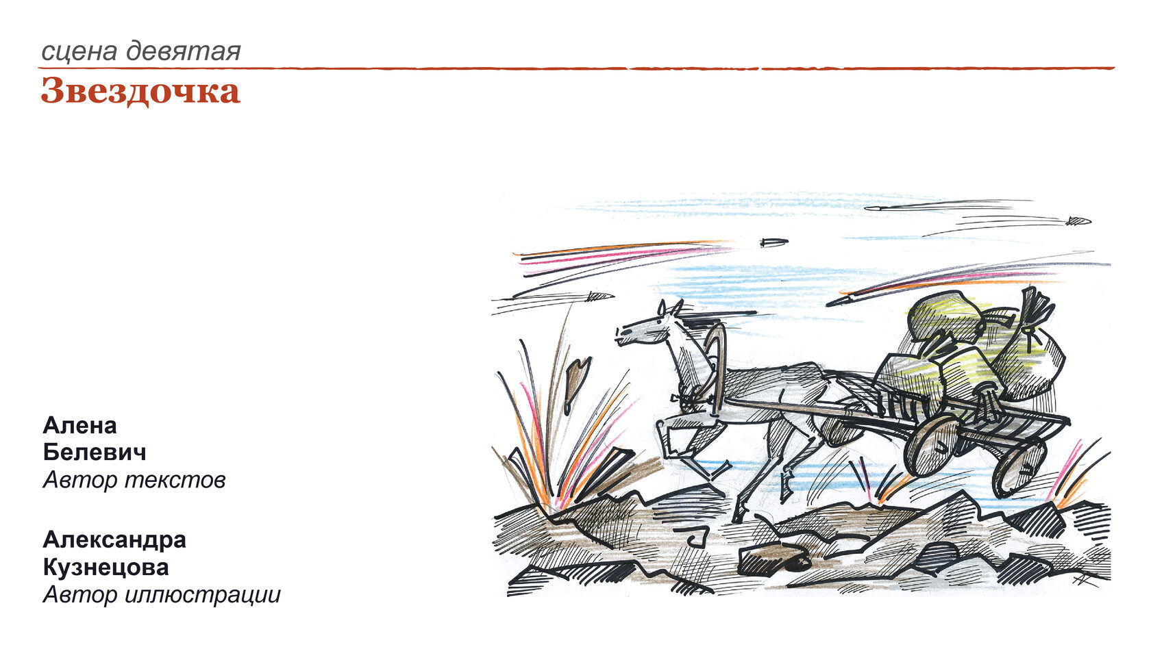 А дед им свое: «Звездочка — лошадка умная, она сможет». Собрали они целую телегу всякого, написали письмо, что это для ленинградских детей приготовлено, и в ночь снарядили лошадку. «Ты, Звездочка, — старик ей говорит. — Ночью иди, а днем прячься. Увидят тебя, сразу убьют. И назад потом не ходи, оставайся людям помогать, лошади всегда работа найдется».
